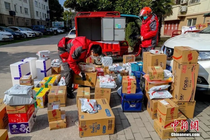 武漢漢口常青花園社區(qū),快遞員卸下快件等待客戶前來(lái)取件。中新社記者 張暢 攝