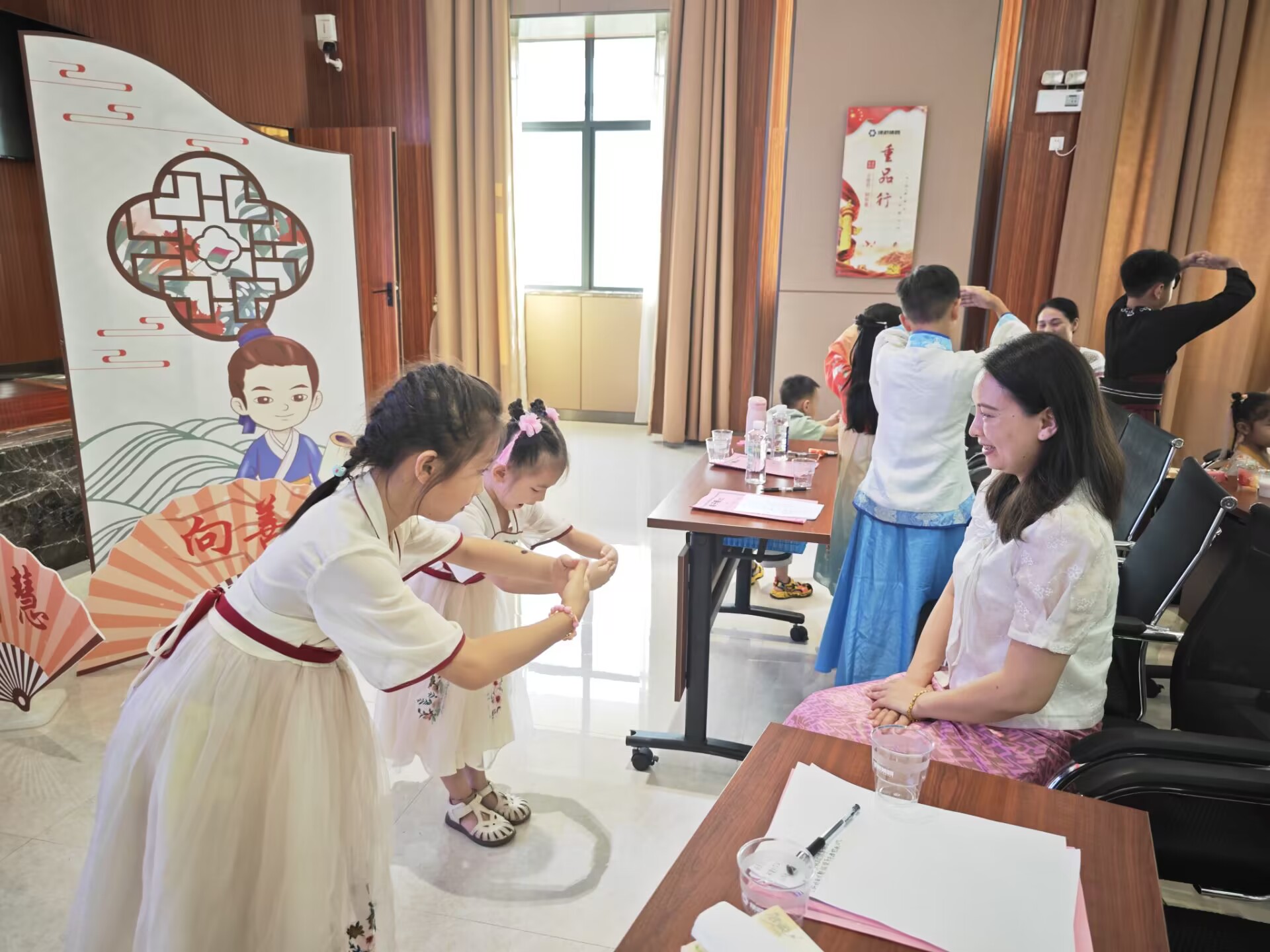 活動以傳統(tǒng)禮儀的學(xué)習(xí)和體驗(yàn)為主題,此次培訓(xùn)邀請了廣西經(jīng)貿(mào)職業(yè)技術(shù)學(xué)院智慧商務(wù)產(chǎn)業(yè)學(xué)院的老師韋斯斯講授少兒禮儀知識。活動中,韋老師向孩子們講解了《弟子規(guī)》中學(xué)習(xí)的重要、做人的道理以及待人接物的禮貌常識,讓大家更好地理解傳統(tǒng)的禮儀。韋老師親身示范,教授大家如何正確行認(rèn)知禮儀、家庭禮儀、餐桌禮儀、待客禮儀、交往禮儀、入泮禮、作揖禮、孝道禮儀等,在抬手躬身中感受禮儀之邦的古韻,學(xué)習(xí)尊師重教的品德。韋老師結(jié)合理論知識學(xué)習(xí),邀請孩子們上臺實(shí)操演練,模擬情景表演、開展親子互動小游戲等,孩子們紛紛上臺,為大家展示,將學(xué)到的文明禮儀知識落實(shí)到行動中,培訓(xùn)現(xiàn)場生動形象、氣氛熱烈,孩子們?nèi)褙炞⒙犎±蠋煹闹v解,依照老師的示范,認(rèn)真的學(xué)習(xí)禮儀,體驗(yàn)傳統(tǒng)禮儀。