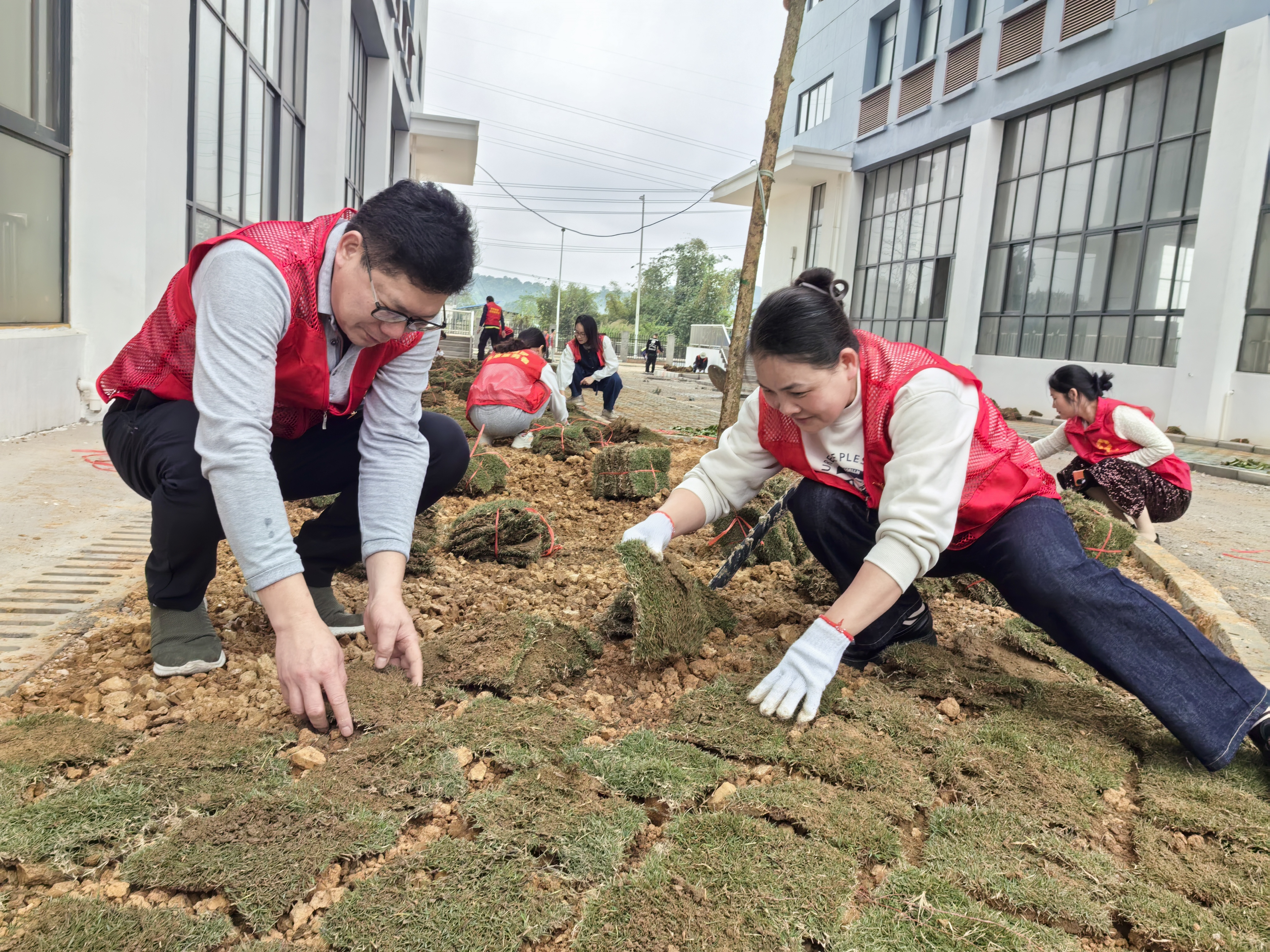 “這棵樹苗要扶正,不然長大后會歪的?!?/span>榮鑫公司黨支部委員、副總經(jīng)理唐欽月一邊指導(dǎo)身邊的同事,一邊用腳輕輕踩實樹苗周圍的泥土。她笑著說:“植樹就像培養(yǎng)孩子,一開始就要打下好基礎(chǔ)。”她的臉上掛著汗珠,但眼神中滿是認(rèn)真。不遠(yuǎn)處,年輕的入黨積極分子楊文君正和同事們一起鋪設(shè)草皮。他們動作熟練,配合默契,不一會兒就鋪出了一大片嫩綠的草地。楊文君擦了擦額頭的汗水,笑著說:“今天雖然累,但看到這片新綠,心里特別踏實。作為入黨積極分子,能和黨員們一起為生態(tài)環(huán)境出一份力,感覺特別有意義。”
