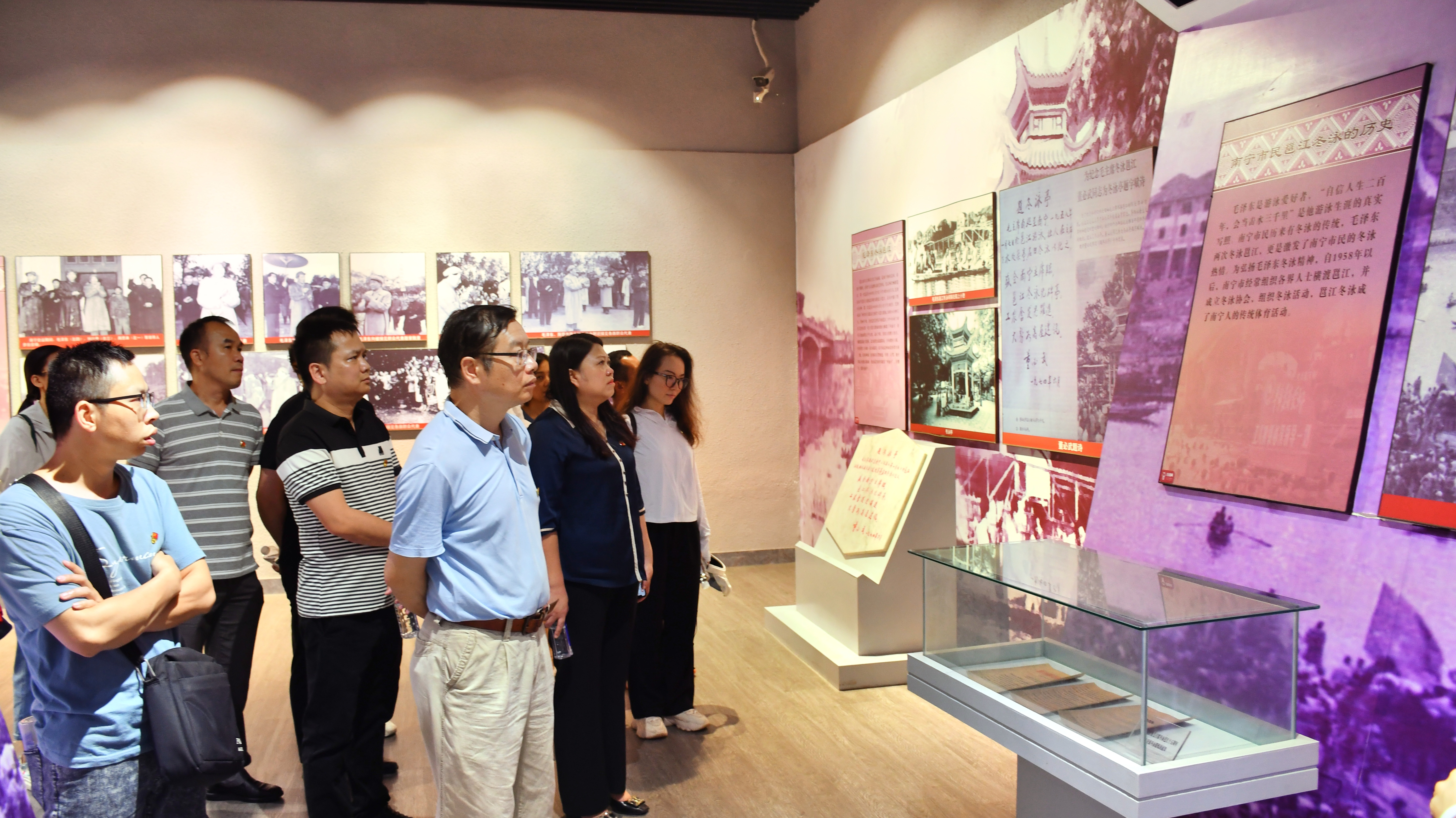 走進(jìn)紀(jì)念館大門,一塊浮雕作品映入眼簾,它再現(xiàn)了1958年毛澤東主席在人民公園望仙坡接見廣西各族人民代表的壯觀場(chǎng)景。時(shí)隔60多年,追尋偉人的足跡,我們一起回憶那段激動(dòng)人心的光輝歲月。紀(jì)念館通過實(shí)物、圖片、文字資料的組合,配以聲、光、色等現(xiàn)代科技手段,展示了1958年1月毛澤東主席在南寧主持召開中央工作會(huì)議期間,接見廣西各族人民代表,對(duì)廣西地方經(jīng)濟(jì)發(fā)展作出高瞻遠(yuǎn)矚指導(dǎo)的活動(dòng)情況,以及劉少奇、周恩來等黨和國家領(lǐng)導(dǎo)人指導(dǎo)廣西社會(huì)主義現(xiàn)代化建設(shè)的歷程。黨員們跟隨著一幅幅照片回顧了人民公園、邕江河畔、軍區(qū)禮堂等毛澤東主席在廣西的歷史足跡和廣西發(fā)展歷史。參與主題參觀學(xué)習(xí)的黨員紛紛表示:“講解員的解說非常讓人心潮澎湃,參觀活動(dòng)是思想上的傳承,激勵(lì)我們帶著這份信念和力量,追隨偉人的足跡,把南寧建設(shè)得更加美好。”